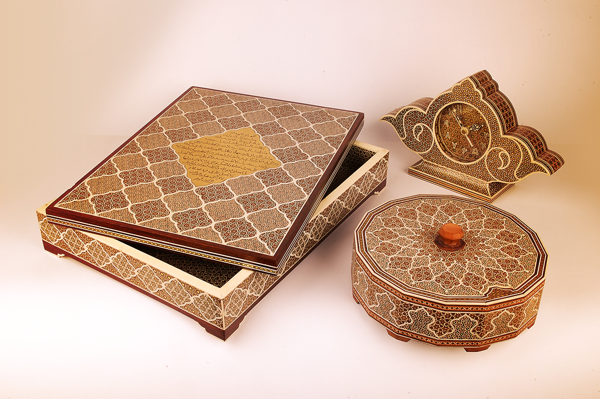 Luego se laminan en láminas de 2 a 3 mm de espesor, y los adhieren a la superficie de las cajas, marcos de fotos, etc. los pulen y rocían el spray sobre ellos para darles brillo. Las obras históricas y ejemplos de este arte incluyen: la gran mezquita de congregación (Jāmeh) Atigh de Shiraz con mil años de antigüedad, el techo del porche principal la gran mezquita de congregación (Jāmeh) Atigh de Shiraz del siglo VIII, las puertas del Salón de los espejos del Palacio de Golestán, el púlpito de madera de la mezquita de Lonban de Isfahán con las formas geométricas y los componentes plateados relacionado al año 1114 AH.También en el año 1315 por orden de Reza Shah Pahlavi, una habitación de siete por siete metros con todo el equipo en ella fue decorada con Jatam por 72 artistas de Shiraz durante 4 años en el palacio de mármol. Los centros más importantes que hacen este arte en Irán, son Isfahán, Shiraz y Teherán que por supuesto, las artistas de Teherán son originalmente de Shiraz o Isfahán.